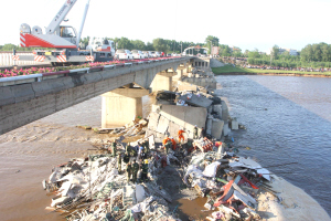 李慶生副市長(zhǎng)介紹,呼蘭河西大橋橋長(zhǎng)187.7米,橋?qū)?5米,是6孔雙幅橋。由于橋齡較長(zhǎng);加之連日大雨,河水沖刷橋體加重,被重車(chē)壓塌。呼蘭河西大橋的使用壽命為30年,限重30噸。呼蘭河西大橋在2006年被定為危橋,2007年曾進(jìn)行維修。