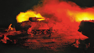 “新大綱規(guī)定,夜訓(xùn)按照年度訓(xùn)練總時(shí)間20%的比例安排。今年,我們著力提高夜間單兵專業(yè)技能的生成和轉(zhuǎn)化!笔F(tuán)長話音剛落,伴著隆隆的炮擊聲,夜暗深處火光頻閃。原來,該師新型教練員、二營教導(dǎo)員杜文斌正在組織官兵進(jìn)行坦克夜間教練射擊課目訓(xùn)練。眼前景象大出記者意料:目標(biāo)顯示不再是一盞孤燈,而是以打信號彈、模擬射擊火光和車輛閃爍明滅的燈光等多種方式,大大增加了射擊難度!皵橙松鋼襞诳谝婚W,你能不能馬上回敬一炮?我們練的就是這個(gè)!”杜文斌自豪地說。