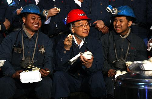 臨近中午12時,從早上7時就下到礦井里工作的工人們要吃中飯了。在巷道里,溫家寶坐在枕木上與工人們一起用餐。他一邊吃飯,一邊詢問工人們的生產(chǎn)生活情況。他對大家說,中國是世界上最大的產(chǎn)煤國,應(yīng)該有世界上最先進的礦井、最先進的技術(shù)和設(shè)備、最優(yōu)秀的產(chǎn)業(yè)工人。在應(yīng)對國際金融危機時,一定要把煤炭生產(chǎn)搞好。必須正確處理保增長與安全生產(chǎn)的關(guān)系,任何時候安全生產(chǎn)都是第一位的,在安全生產(chǎn)中實現(xiàn)經(jīng)濟平穩(wěn)較快增長。同時,要下決定引進新技術(shù),大力推進清潔生產(chǎn),讓煤炭生產(chǎn)質(zhì)量和效益走在世界的前列。溫家寶在礦井下呆了兩個小時,才與礦工們惜別。