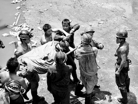 11時(shí)35分,施救人員把堵塞該巷道的淤泥和煤塊清開(kāi),發(fā)現(xiàn)里面有3名被困的工人,而且這3名工人還能說(shuō)話,意識(shí)也是清醒的。施救人員立即用黑布將3人的眼睛包裹住,然后每8名救援人員用擔(dān)架抬起一名被困者,慢慢將他們送至井口。此時(shí),早已聞?dòng)嵉尼t(yī)務(wù)人員來(lái)到井口,分別為3名礦工輸液,以保持生命體能。