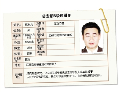 施永兵,曾用名戴兵,男,出生于1970年5月8日,江蘇南京棲霞區(qū)石埠橋村人,身份證號(hào)碼為320113197005080817。此人操江蘇口音,體型微胖,方臉,身高175厘米。公安機(jī)關(guān)以其涉嫌非法經(jīng)營(yíng),正在全力追捕。