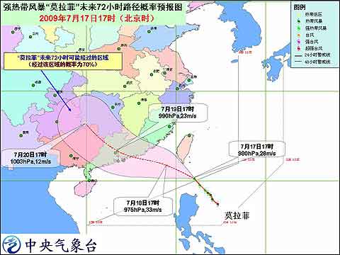 為應對臺風“莫拉菲”的兇猛襲擊,二十四小時內,中國氣象局兩次提高氣象災害應急響應命令級別。18日早中國氣象局局長鄭國光宣布將氣象災害應急響應級別提高至Ⅱ級。并立即派出工作組,赴現(xiàn)場指導氣象服務和災害防御工作。