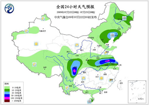 中新網(wǎng)7月22日電 中央氣象臺2009年7月22日06時(shí)發(fā)布未來三天天氣趨勢預(yù)報(bào)稱,江淮黃淮四川盆地江南北部等地有強(qiáng)降水,江南華南西南地區(qū)東部等地仍有高溫。