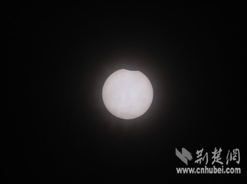 22日上午8時(shí)14分,日全食初虧在湖北武漢顯現(xiàn),圖為記者在湖北日報(bào)傳媒大廈拍攝的初虧奇觀。