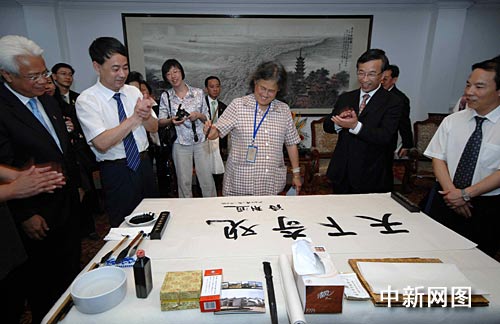 在觀看日全食版錢塘潮后,詩琳通盛贊“非常好”。在現(xiàn)場人員的掌聲中,詩琳通還以毛筆親自書寫了“天下奇觀”四個大字。