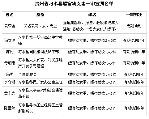 其中,被告人馮支洋(習(xí)水縣第一職業(yè)高級(jí)中學(xué)教師)嫖宿幼女2人3次;被告人陳村(習(xí)水縣同民鎮(zhèn)司法所干部)嫖宿幼女1人2次;被告人母明忠(習(xí)水縣人大代表、利民房地產(chǎn)開(kāi)發(fā)公司經(jīng)理)嫖宿幼女2人2次;被告人馮勇(個(gè)體駕駛員)、李守明(習(xí)水縣移民開(kāi)發(fā)辦公室主任)、黃永亮(習(xí)水縣人事勞動(dòng)和社會(huì)保障局干部)、陳孟然(習(xí)水縣馬臨工業(yè)經(jīng)濟(jì)區(qū)土管所副所長(zhǎng))分別嫖宿幼女1人1次。