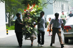 上午11時(shí)許,原國(guó)家體委主任伍紹祖前來(lái)吊唁,他身著黑色西服,面色凝重,他看著工作人員從車上卸下花圈后進(jìn)入大院。