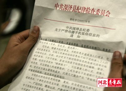 記者了解到,深澤縣委常委、紀(jì)委書(shū)記張慶民是此事的主要推動(dòng)者之一。在他們的推動(dòng)下,經(jīng)多次討論,并向深澤縣委多次匯報(bào)后,才出臺(tái)了“嚴(yán)禁傳播手機(jī)低俗信息的通知”。