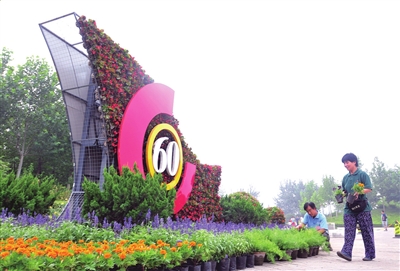 記者在現(xiàn)場看到,經(jīng)過幾個(gè)晝夜的施工,“普天同慶”花壇已經(jīng)完全呈現(xiàn)出主題,紅、綠、黃等顏色的鮮花不僅烘托著國慶的喜慶氣氛,還巧妙地構(gòu)建出“60”的國慶造型,而用鮮花組成的六個(gè)大圓球以及紅旗更讓游客稱贊不已。