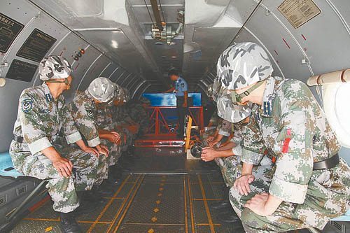 執(zhí)行空中撒播催化劑任務(wù)的是空降兵某團(tuán)的特種兵們,他們曾多次從這種型號的運(yùn)輸機(jī)上練習(xí)跳傘,但這次的任務(wù)是在規(guī)定時(shí)間內(nèi),快速將消云減雨的催化劑播撒完畢。