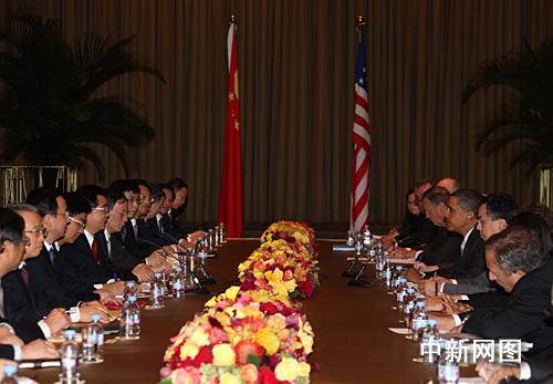 胡錦濤說,我高興地看到,當(dāng)前中美關(guān)系總體上呈現(xiàn)良好發(fā)展勢頭,我和奧巴馬在倫敦達(dá)成的各項共識正在得到落實,雙方正在共同建設(shè)積極合作全面的中美關(guān)系。