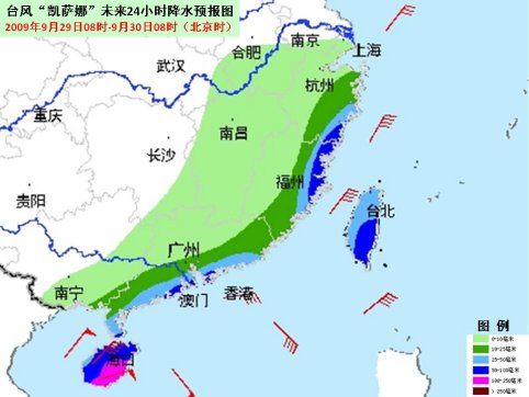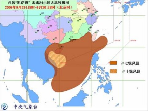 受“凱薩娜”及其外圍云系的影響,29日白天到夜間,南海大部海面、北部灣海面、瓊州海峽、海南沿海、廣西沿海將有7~9級大風,“凱薩娜”中心經(jīng)過的附近海面或地區(qū)的風力將有10~13級大風,陣風可達14~16級;巴士海峽、巴林塘海峽、臺灣海峽、臺灣以東海面、廣東沿海、福建中南部沿海也將有6~7級大風,陣風可達8~9級;浙江東南部、福建東部、臺灣、廣東南部、海南等地有大雨或暴雨,海南南部的局部地區(qū)有大暴雨或特大暴雨。