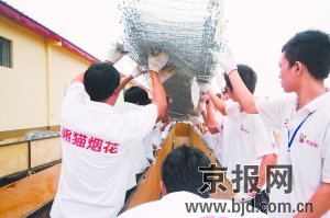 在房山一間面積達(dá)1500米的煙花專用倉(cāng)庫(kù),200名熊貓煙花工作人員星夜兼程,干了近100天,將30余萬(wàn)發(fā)煙花分別定位到3個(gè)巨型網(wǎng)幕上。為了防備國(guó)慶夜降雨,技術(shù)人員使用了電子加固器,給“網(wǎng)幕焰火”穿上了統(tǒng)一規(guī)格的“風(fēng)雨衣”。