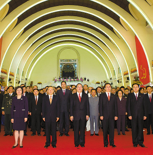 為熱烈慶祝偉大的中華人民共和國成立60周年,上海市市長韓正昨晚在上海展覽中心舉行盛大國慶招待會,中共中央政治局委員、上海市委書記俞正聲與800位中外來賓歡聚一堂,共慶共和國偉大光輝的節(jié)日。