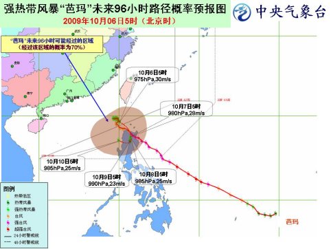 中新網(wǎng)10月6日電 中央氣象臺(tái)6日6時(shí)發(fā)布臺(tái)風(fēng)預(yù)報(bào)稱,今年第17號(hào)強(qiáng)熱帶風(fēng)暴“芭瑪”將以每小時(shí)10公里左右的速度向南偏東方向移動(dòng),并將于6日下午到夜間在菲律賓呂宋島北部沿海登陸,強(qiáng)度緩慢減弱。