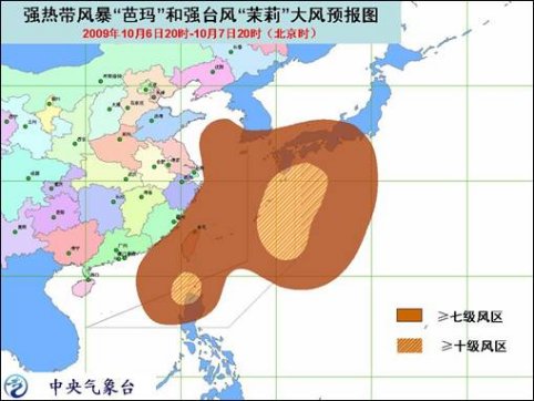 受“茉莉”和南下冷空氣的共同影響,6日夜間至7日白天,東海大部、黃海南部將有7-8級(jí)大風(fēng),陣風(fēng)可達(dá)9-10級(jí),其中東海東部將有9-10級(jí)大風(fēng),陣風(fēng)可達(dá)11-13級(jí)。