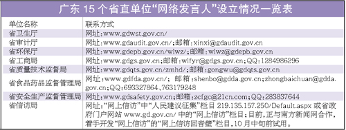 (廣東)省委辦公廳第二次網(wǎng)友集中反映問題交辦會(huì)要求首批設(shè)立“網(wǎng)絡(luò)發(fā)言人”的l5個(gè)省直單位,至昨天已全部設(shè)立“網(wǎng)絡(luò)發(fā)言人”,并開始履行職責(zé)。這標(biāo)志著廣東在建立網(wǎng)絡(luò)發(fā)言人制度上邁出實(shí)質(zhì)性步伐。