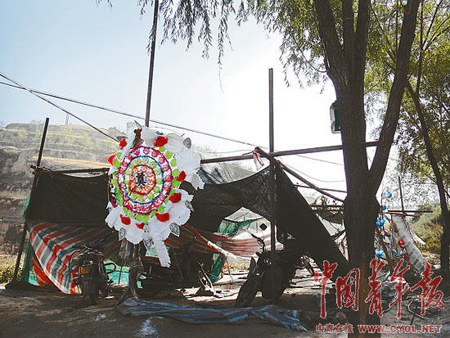 10月20日上午11時(shí)許,山西省呂梁市臨縣林家坪鎮(zhèn)白家峁村。村口不遠(yuǎn)靠近公路的空地上,有幾個(gè)用棚布搭起的簡(jiǎn)易帳篷,有的被燒得只剩下幾塊破布,在秋風(fēng)中無力地?fù)u曳著。這是幾個(gè)月前村民為護(hù)礦搭起來的,現(xiàn)在成了村民郝兔照的靈堂。他的棺材已經(jīng)在這里放了8天,旁邊擺放著花圈、供品。