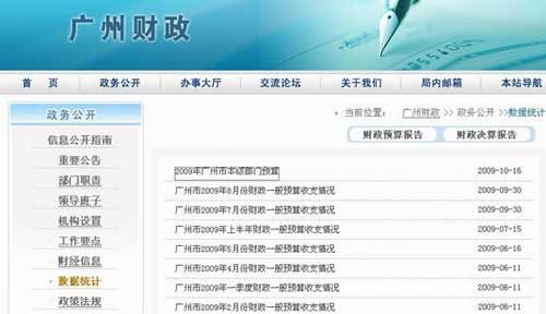 查詢方式為,登陸廣州財政網(wǎng)站()后,點擊打開“政務(wù)公開”欄目中的“數(shù)據(jù)統(tǒng)計”一欄(/zwgk/sjtj/index.htm),可以看到《2009年廣州市本級部門預(yù)算》的鏈接,打開之后為一個簡單的114個部門的索引列表。