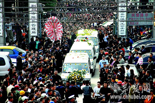 近萬名學(xué)生和社會各界群眾自發(fā)地參加追悼會。人們早早地趕到荊州市殯儀館,手捧菊花、富貴竹,胸別白花,緩緩進(jìn)入靈堂,送英雄最后一程。