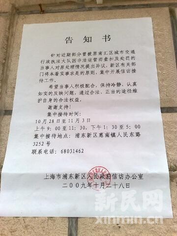 上海新民網(wǎng)今日透露以上信息。據(jù)報道,一份28日由上海市浦東新區(qū)人民政府信訪辦公室出具的告知書稱:“針對近期部分曾被原南匯區(qū)城市交通行政執(zhí)法大隊因非法運(yùn)營而查扣及處罰的當(dāng)事人對原處理情況提出異議,新區(qū)有關(guān)部門將本著實(shí)事求是的原則,集中開展信訪接待工作。”