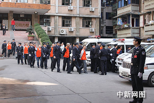 中新網(wǎng)重慶11月3日電(銀雪)重慶抓獲的十九個(gè)涉黑團(tuán)伙中唯一女首犯謝才萍3日上午一審宣判:謝才萍被控的組織、領(lǐng)導(dǎo)黑社會(huì)性質(zhì)組織罪、開設(shè)賭場(chǎng)罪、非法拘禁罪、容留他人吸毒罪、行賄罪五宗罪成立,被判有期徒刑18年,并處罰金102萬(wàn)元人民幣。圖為判決后謝才萍團(tuán)伙成員走出法庭。