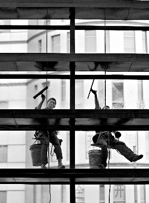 在第一家保潔公司,他認(rèn)識了“高空作業(yè)”:一根繩、一個桶,主要是和廣告牌打交道。沒有“蜘蛛人”這么時(shí)髦的叫法,那時(shí)都叫爬墻工。