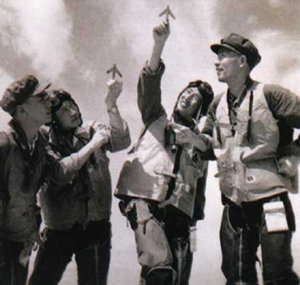 “01,敵F-4兩架侵入我國領空,已被我高炮部隊擊落一架,另一架正在你右前方二十五公里,繼續(xù)向我境內(nèi)飛行。航向一百六十度、高度二千米、速度一千公里,準備戰(zhàn)斗!钡孛嬷笓]員向飛行員發(fā)出了命令。宋義民立即指揮戰(zhàn)友調(diào)整空中戰(zhàn)斗隊形,組織搜索警戒。情況顯示板上、熒光屏上敵機的航跡在不斷地向我境內(nèi)延伸。突然,二號機趙廣江大聲報告“右前方發(fā)現(xiàn)一架敵機!敝笓]員拿起話筒:“跟上去,狠狠打!”隨即一號機、三號機、四號機都發(fā)現(xiàn)了目標,在長機宋義民的指揮下,三架飛機加大油門一齊向敵機撲去。