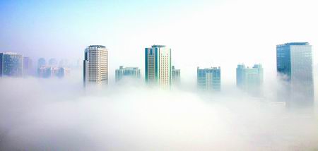 前兩日,鄭州遭遇有氣象記錄以來最大的暴雪襲擊。昨天早上,暴雪后鄭州市區(qū)出現(xiàn)霧海奇觀,市區(qū)建筑在霧中若隱若現(xiàn)猶如“海市蜃樓”,讓人嘆為觀止!翱炜,東區(qū)的大樓好像在云朵之上似的!”昨日一大早,很多市民打來熱線反映此事。