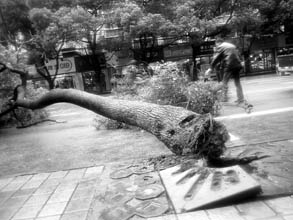 隨后,這棵樹迎風墜地,樹根被連根拔起,發(fā)出巨大的砰響聲,周邊的地磚也被鑿裂。當記者趕至現(xiàn)場時看到,這棵大樟樹直徑約有20公分,高約5米。