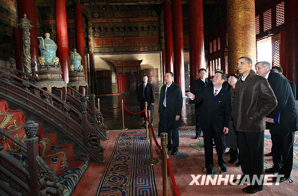 脫下西裝,摘掉領(lǐng)帶,不帶閣僚,美國總統(tǒng)奧巴馬17日下午在緊張的政治活動間隙,忙里偷閑來到故宮博物院參觀。