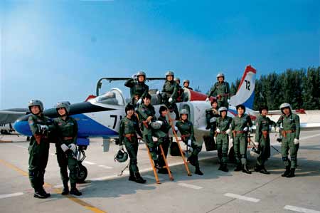 這個(gè)英雄群體共有16名殲擊機(jī)女飛行員,分別來(lái)自陜西、遼寧、河北、山東、山西、四川、江蘇、浙江、湖北9個(gè)省,最大24歲,最小22歲,是空軍2005年招收的第8批女飛行學(xué)員中的佼佼者。4年來(lái),她們輾轉(zhuǎn)航空大學(xué)、兩所飛行學(xué)院,歷經(jīng)基礎(chǔ)教育、初教機(jī)訓(xùn)練、高教機(jī)訓(xùn)練3個(gè)階段,實(shí)現(xiàn)了從一名高中生到軍人再到女飛行員的人生飛躍。她們用堅(jiān)韌、智慧克服了常人難以想象的困難,從仰望藍(lán)天到擁抱藍(lán)天并最終融入藍(lán)天。在她們身上,既承載著中國(guó)軍人的共同使命,也閃爍著自己特有的光芒。