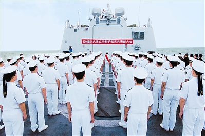 綬帶映紅碧波,掌聲響徹大洋。今天(當(dāng)?shù)貢r間11月25日)下午4時,中國海軍第三批護航編隊“火線立功和護航尖兵表彰大會”在“舟山”艦飛行甲板舉行。