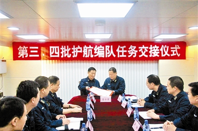 根據(jù)海軍部署,從當(dāng)?shù)貢r(shí)間11月27日1時(shí)開(kāi)始,中國(guó)海軍第四批護(hù)航編隊(duì)正式接替第三批護(hù)航編隊(duì)擔(dān)負(fù)亞丁灣、索馬里海域護(hù)航任務(wù),“千島湖”艦轉(zhuǎn)隸第四批護(hù)航編隊(duì)指揮。交接過(guò)程按照編隊(duì)指揮組、政工組、后勤組、裝備組的順序組織實(shí)施。第三批護(hù)航編隊(duì)將相關(guān)文件、物資、器材和備品配件移交給第四批護(hù)航編隊(duì)。第三批護(hù)航編隊(duì)指揮員、東海艦隊(duì)副司令員王志國(guó)和第四批護(hù)航編隊(duì)指揮員、東海艦隊(duì)副參謀長(zhǎng)邱延鵬在任務(wù)交接書(shū)上簽字。