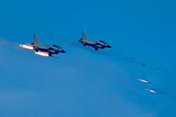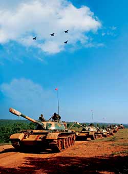 記者在演習(xí)現(xiàn)場(chǎng)看到,在某高地的爭(zhēng)奪戰(zhàn)中,紅藍(lán)雙方拼得異常激烈。拂曉剛過(guò),“藍(lán)軍”15架飛機(jī)從多個(gè)方向同時(shí)出現(xiàn)在“紅軍”空域,準(zhǔn)備對(duì)“紅軍”目標(biāo)同時(shí)發(fā)起攻擊。“紅軍”毫不示弱,偵察飛機(jī)主動(dòng)出擊,出其不意地對(duì)敵情報(bào)預(yù)警系統(tǒng)實(shí)施欺騙性干擾,與此同時(shí),“紅軍”空中攔截兵力強(qiáng)行突防飛抵目標(biāo)上空,朝敵機(jī)猛撲過(guò)去,為奪取局部制空權(quán),與敵機(jī)展開(kāi)了一場(chǎng)生死大戰(zhàn)。瞬間,方圓數(shù)百公里的戰(zhàn)場(chǎng)陡然升溫。爾后,“紅軍”空中轟炸機(jī)群多批次、多架次、不間斷對(duì)敵縱深目標(biāo)進(jìn)行持續(xù)轟炸,使敵指揮機(jī)構(gòu)、通信樞紐等重要目標(biāo)遭到癱瘓性打擊。