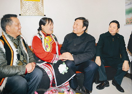李源潮一下火車,就與同來慰問的省委書記、省人大常委會主任劉奇葆一起直奔北川縣看望災區(qū)群眾,來到剛剛重建起來的擂鼓鎮(zhèn)吉娜羌寨。在地震中羌族同胞劉賢惠失去了丈夫、王孝萬失去了妻子,在當?shù)攸h委政府的關(guān)心下,他倆災后組成了新家庭,住上了新房子,找到了新產(chǎn)業(yè),過上了新生活,有了新希望。劉賢惠緊緊拉著李源潮的手說:“感謝黨、感謝政府!全靠黨的政策好,讓我們?yōu)暮筮^上了好日子!”李源潮祝愿他們白頭偕老,日子越過越好。