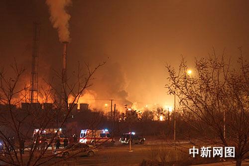 記者從現(xiàn)場看到,事故現(xiàn)場仍然在燃燒。在消防人員的搶救下,火勢比傍晚時分要小些。