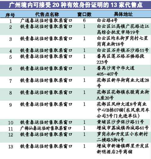 持除二代居民身份證以外的19種有效身份證件購票,在鐵路部門設立的集中售取票點、車站售票窗口以及廣東境內(nèi)的79家代售點可以購買實名制車票,記者了解到,其中廣州有13家這樣的代售點,大部分分布在白云區(qū)、番禺區(qū)、花都區(qū),其他代售點可以辦理二代身份證購買實名制火車票。