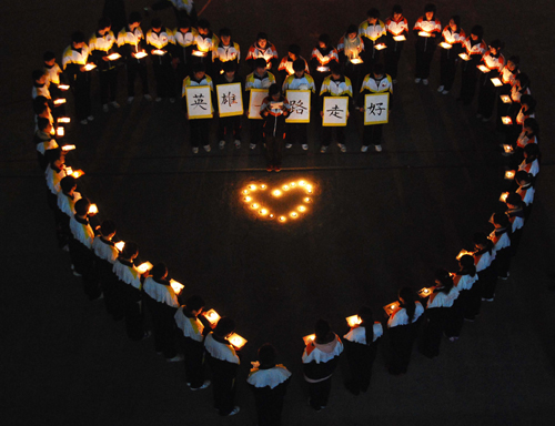 得知中國(guó)在海地地震中遇難的八名維和英雄遺體于一月十九日上午運(yùn)抵北京,江西九江市晨光中學(xué)五十余名從四川地震中走出來的綿陽籍學(xué)生倍感悲傷,晚上七點(diǎn)半左右,為表達(dá)對(duì)英烈們的緬懷之情,綿陽班開展以“為英雄哀悼,為海地祈愿“為主題的燭光祈愿活動(dòng)。