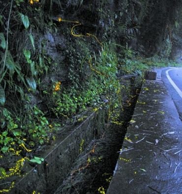 而在臥龍,付新華還發(fā)現了擁有33個發(fā)光器并同步發(fā)光的多光點螢,兩厘米長、圓筒形的體形、金黃的體色,翅膀完全退化。白天,她躲藏在土縫中躲避敵害。夜晚,她爬出土縫,身上33個發(fā)光器持續(xù)發(fā)出黃綠色的亮光,使捕食者不敢侵犯。其實她是在保護懷中的卵。