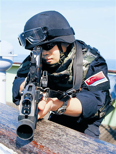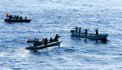 12時28分,巢湖艦在艦載直升機(jī)的引導(dǎo)下鎖定了正在轉(zhuǎn)向“鴻達(dá)號”商船的疑似海盜快艇。在發(fā)射3枚信號彈予以警告后,疑似海盜快艇被迫停車,隨后趕到的馬鞍山艦迅速派出2艘小艇靠近,特戰(zhàn)隊(duì)員將其驅(qū)離。