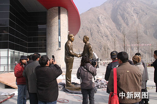 中新網(wǎng)汶川1月29日電(薛升玉 張瑤)1月29日上午,汶川縣體育館前鑼鼓陣陣,“咔嚓”的快門(mén)聲不斷,一尊高2.98米、寬1.68米、厚0.94米的“胡主席和溫總理在災(zāi)區(qū)”大型雕塑吸引了許多過(guò)往群眾駐足留影。這尊由陜西省大荔縣宣傳部捐贈(zèng)的大型雕塑,將收藏到汶川縣禹羌博物館。