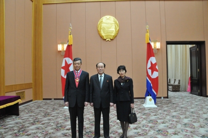 劉曉明大使夫人胡平華及中國駐朝鮮使館外交官、朝鮮最高人民會議常任委員會對外事業(yè)部長林賢輔,外務(wù)省副相金亨俊等參加授勛儀式。