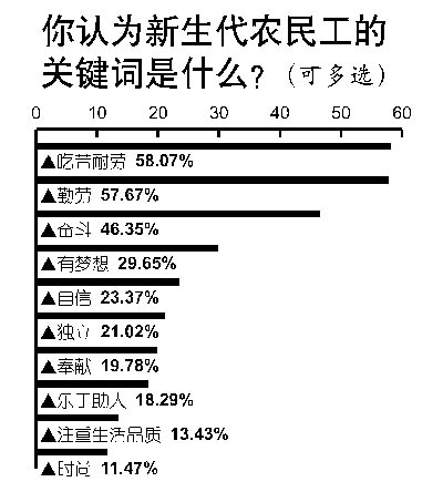 雖然專(zhuān)家指出,新生代農(nóng)民工具有“三高一低”的特征,即受教育程度高,職業(yè)期望值高,物質(zhì)和精神享受要求高,工作耐受力低。但本次調(diào)查中,當(dāng)問(wèn)到新生代農(nóng)民工的關(guān)鍵詞,“吃苦耐勞”仍以58.1%的支持率排名第一,“勤勞”以57.7%的支持率緊隨其后,排在第三位的是“奮斗”(46.4%)。