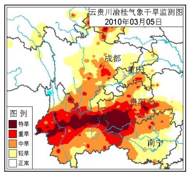 中新網(wǎng)3月5日電 中央氣象臺(tái)3月5日18時(shí)繼續(xù)發(fā)布干旱黃色預(yù)警:根據(jù)3月5日監(jiān)測(cè),云南大部、貴州大部、四川南部和廣西西北部等地維持氣象干旱重旱等級(jí)。預(yù)計(jì),未來(lái)三天,除云南西北部和東北部、貴州大部有小到中雨(雪)外,其它旱區(qū)基本無(wú)降水。云南大部、貴州西部、四川南部、廣西西部氣象干旱將持續(xù)發(fā)展。