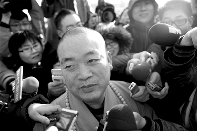 每次人大代表“走紅地毯”時,圓臉方耳、身穿黃色袈裟、足蹬黑色布鞋的全國人大代表、少林寺方丈釋永信一出現(xiàn)在廣場上就會被記者團(tuán)團(tuán)包圍,“方丈,聽說你開越野車”“方丈,你現(xiàn)在是住在大別墅了吧?”……面對大家拋出的各種問題,他不急不惱,邊低聲念“阿彌陀佛”邊試圖向密不透風(fēng)的人墻外移動。見叱咤少林寺的大師卻被眾人圍堵得步履維艱,好事者喊了句“大師,用輕功啊”!大師就是大師,面對記者們刁鉆的問題,他往往用微笑代替回答,“我知道,就算我不說話,也會成為新聞”。