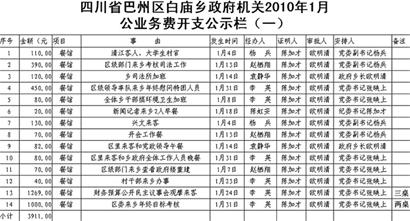 帖子內(nèi)名為《四川省巴州區(qū)白廟鄉(xiāng)政府機(jī)關(guān)2010年1月公業(yè)務(wù)費(fèi)開(kāi)支公示》的表格顯示,1月份,鄉(xiāng)政府支出公業(yè)務(wù)費(fèi)44筆,共8240.5元,其中最大的一筆開(kāi)支是,1月24日招待“財(cái)務(wù)預(yù)算公開(kāi)民主議事會(huì)觀摩來(lái)客”,請(qǐng)客三桌,花費(fèi)1269元,最小的一筆開(kāi)支僅為“購(gòu)買信紙”,花費(fèi)1.5元。
