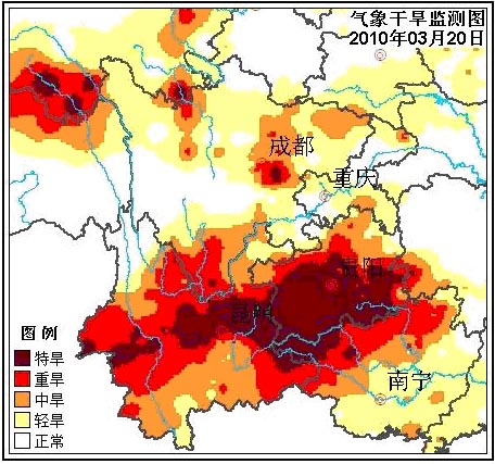 中央氣象臺(tái)3月20日18時(shí)繼續(xù)發(fā)布干旱黃色預(yù)警:根據(jù)3月20日監(jiān)測(cè),云南大部、貴州中部和西南部、川西高原南部和廣西西北部等地維持氣象干旱重旱等級(jí)。23日,貴州中東部有小雨或陣雨;未來(lái)三天,云南、川西高原南部、廣西西北部等旱區(qū)基本無(wú)降水,云南、貴州、川西高原南部、廣西西北部等氣象干旱區(qū)旱情將持續(xù)或發(fā)展。
