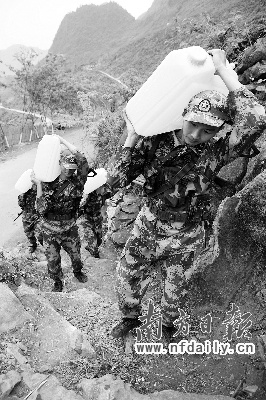 “出發(fā)!”昨日清晨,隨著廣州軍區(qū)某邊防連連長沈素江一聲令下,載著10名官兵的巡邏車向百色平孟鎮(zhèn)疾馳而去。10多個裝滿水的白色塑料桶將本不寬敞的車廂塞得更顯擁擠。