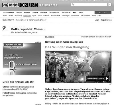 德國(guó)《明鏡》周刊網(wǎng)絡(luò)版以“鄉(xiāng)寧的奇跡”為題,報(bào)道了山西省臨汾市鄉(xiāng)寧縣王家?guī)X煤礦115名礦工成功升井的壯舉。報(bào)道說(shuō):“3000多名救援人員在過去的幾天里夜以繼日地不間斷救援。為了不讓自己因疲憊倒下,他們將自己用皮帶固定在坑道壁上,渴了就喝坑道冒出來(lái)的水!钡赂鞔竺襟w網(wǎng)絡(luò)版在刊登該消息時(shí)全部引用了擔(dān)任中國(guó)政府礦山安全顧問的專家大衛(wèi)·費(fèi)克爾特的話:“這是礦業(yè)歷史上的一次最令人驚嘆的援救行動(dòng)!”